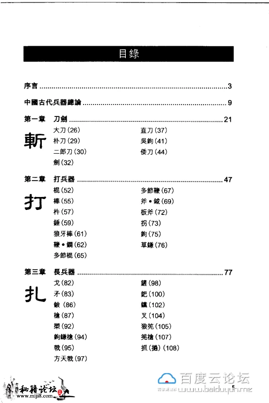 书中以“斩”、“打”、“扎”、“射”、“城”、“火”、“暗”、“甲”八个类别对中国古代兵器进行描述。