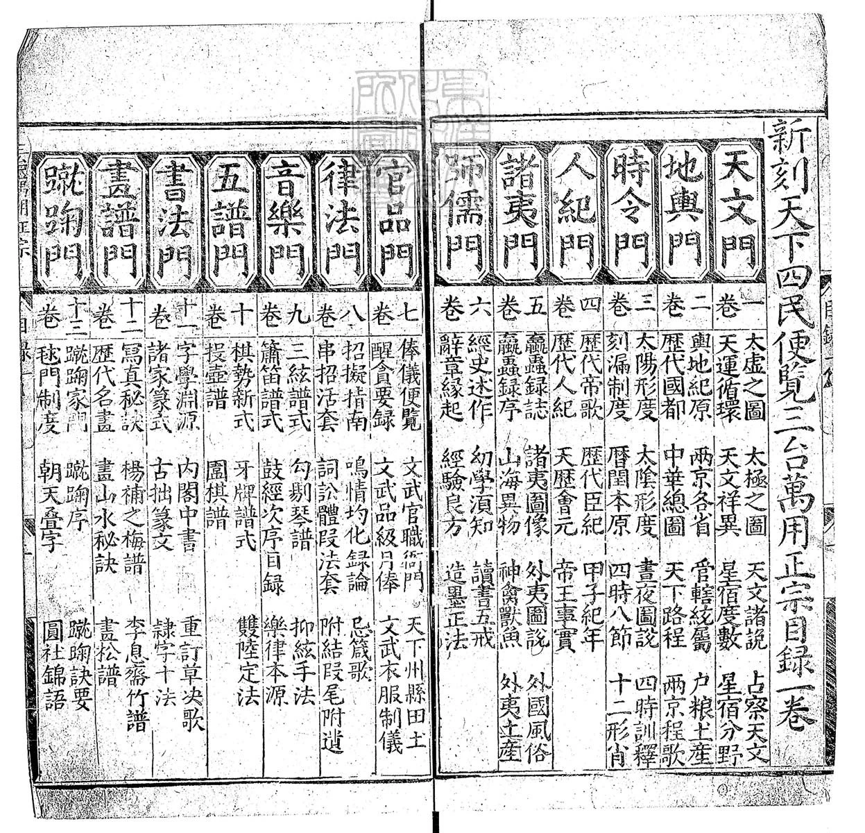《新刻天下四民便览三台万用正宗》,三台馆主人仰止余象斗纂,明万历己亥(万历二十七年)余氏双峰堂刊本,择吉类古籍。