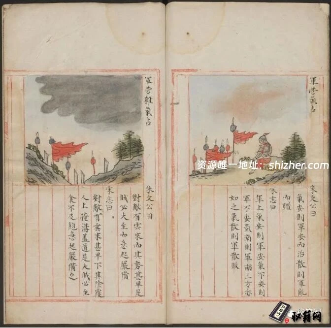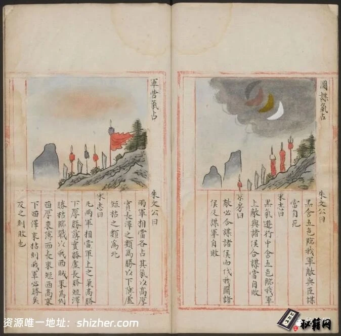 这本书可能的名字是《运气占》,可能是《军中候气说》和《云气出入三垣说》的一个合编本。它是一套通过天文气象占卜世事的书籍,有彩色配图和摘自史书的解释文字。此本为朱丝栏彩色钞本。