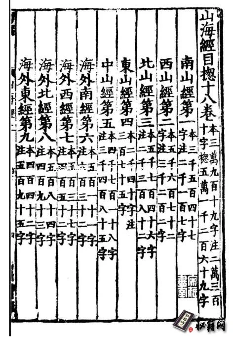 《山经》5卷为:《南山经》、《西山经》、《北山经》、《东山经》、《中山经》,又称为《五藏山经》;《海经》分为《海外经》、《海内经》、《大荒经》,每部下面又有数卷。《海外经》包括《海外南经》、《海外西经》、《海外北经》、《海外东经》4个部分;《海内经》包括《海内南经》、《海内西经》、《海内北经》、《海内东经》4个部分;《大荒经》包括《大荒东经》、《大荒南经》、《大荒西经》、《大荒北经》、《海内经》(并非前面的《海内经》)5个部分。