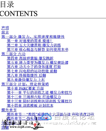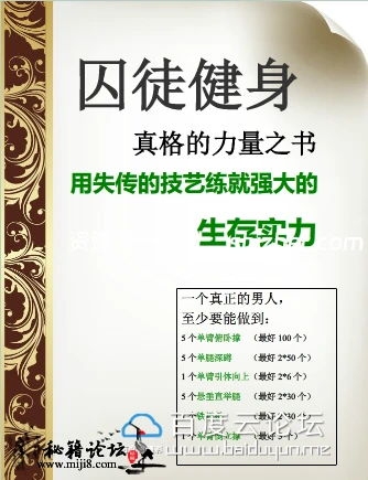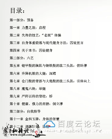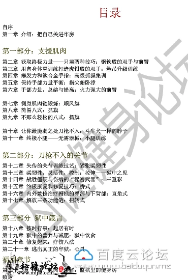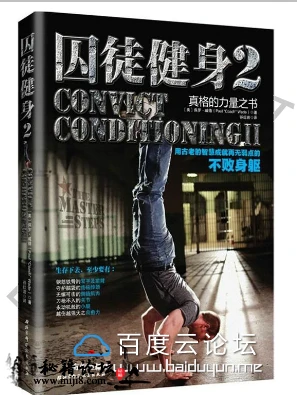 封面及目录截图 在线面哦 !!! 介绍: 这不是一本教你练出“可爱肌肉”的书,而是一本教你练出能用的力量、极限的力量、生存的力量的书。作者保罗·威德在美国最严酷的监狱中 度过了19年,在其中逐渐挖掘出了一套最古老的健身法,在商业社会中早已失传的力量哲学,并凭此成为了地球上最强壮的人之一——这让 他 得以有尊严地生存下来。出狱之后,他把这套失传的技艺整理并公之于世——这是他带给我们的最珍物。 生存下去,至少要有:钢筋铁骨的双手及前臂,守护脑袋的终极脖颈,永动机般的小腿,无懈可击的侧链肌肉,刀枪不入的关节,越受伤越强大 的自愈力。