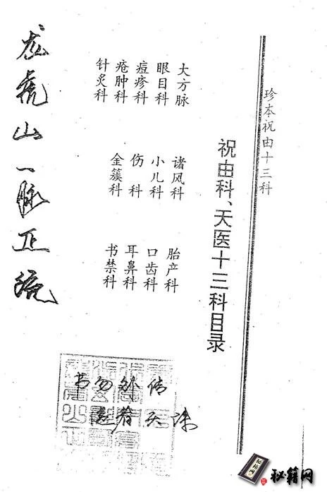 眼科、伤科、耳鼻科、产科、金簇科、小儿科、针灸科、等十三门,简称祝由十三科,