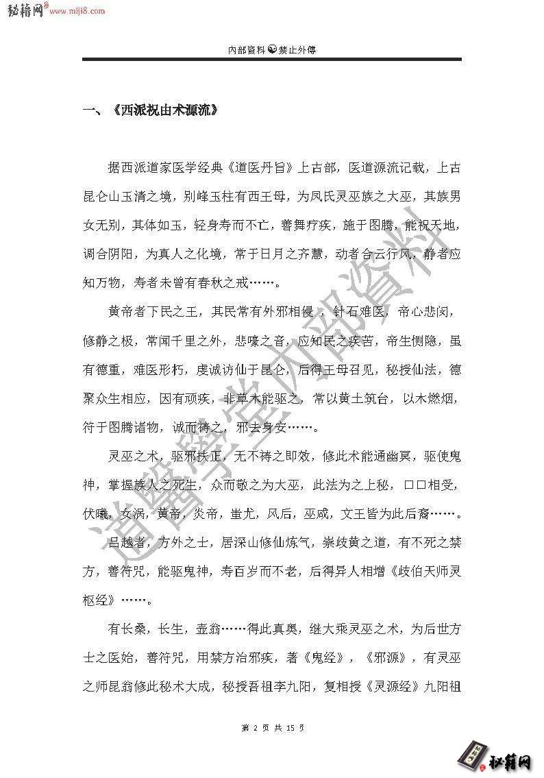 《西派祝由术源流》据西派道家医学经典《道医丹旨》上古部,医道源流记载,上古昆仑山玉清之境,别峰玉柱有西王母,为风氏灵巫族之大巫,其族男女无别,其体如玉,轻身寿而不亡,善舞疗疾,施于图腾,能祝天地,调合阴阳,为真人之化境,常于日月之齐慧,动者合云行风静者应知万物,寿者未曾有春秋之戒……。