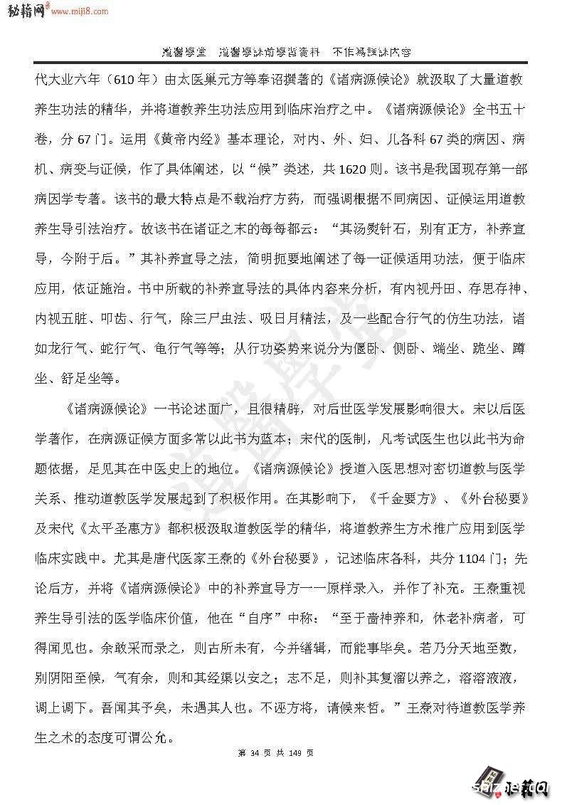 道需攀堂道需翠课前琴智资料不作焉蔬踝内容道教医学发展史、道教医学思想、道教医学疗法等方面。道教医学的一个分支内丹学的研究也有所进展,作为集传统医学养生学之大成的内丹学蕴含着深刻的内丹医学思想,相关研究涉及内丹医学的体系、理论内容与特征、心理学本质、生命哲学思想等方面。此外由于道教医学具有很强的历史继承性、包容性与实践性。因此,学习道教医学需要注重研究构成其思想的核心,即从道家、道教思想、传统医学思想等方面把握其独特的生命观、疾病预防治疗观;道教医学涉取与包容了以往所有医学成就的精华,博大精深,因而需要从各个角度探讨其医学思想的本质特征;道教医学的实践性特征,主要表现为它作为医疗养生技术方面,这决定了学习者需要联系实际,通过自身的不断深入体验,掌握其技术要领。