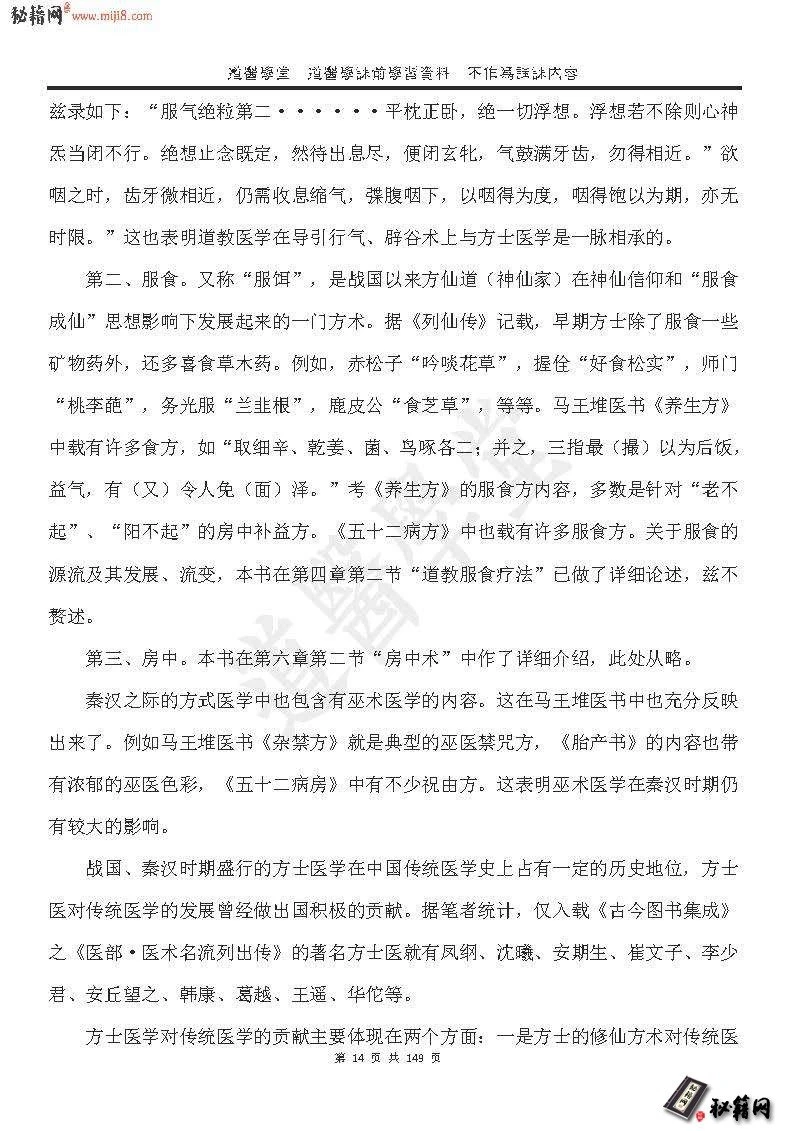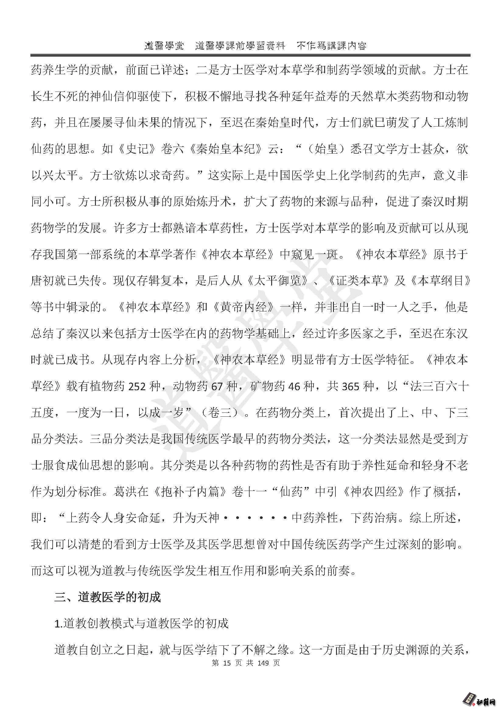 正是在这一宗教与医学相互交融的历史过程中,道教医学得以逐渐产生,并经过汉魏两晋南北朝道教名士对传统医学不断融摄与创发,初步形成了中国传统医学的一个流派。就其历史渊源而言,道教医学的源头可以远溯道原始宗教之巫术医学,而他的直第7页共149页