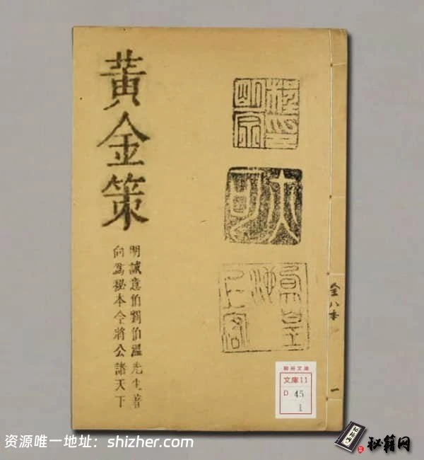 《黄金策》题明.刘基著。刘基,字伯温,明朝开国重臣,精通术数。此书为火珠林卦法的集大成之作,是研究火珠林法的经典。明清术士莫不奉之圭臬。目前在民间流传甚广的《卜筮全书》、《增删卜易》、《卜筮正宗》都收录了此书,可见影响之大。