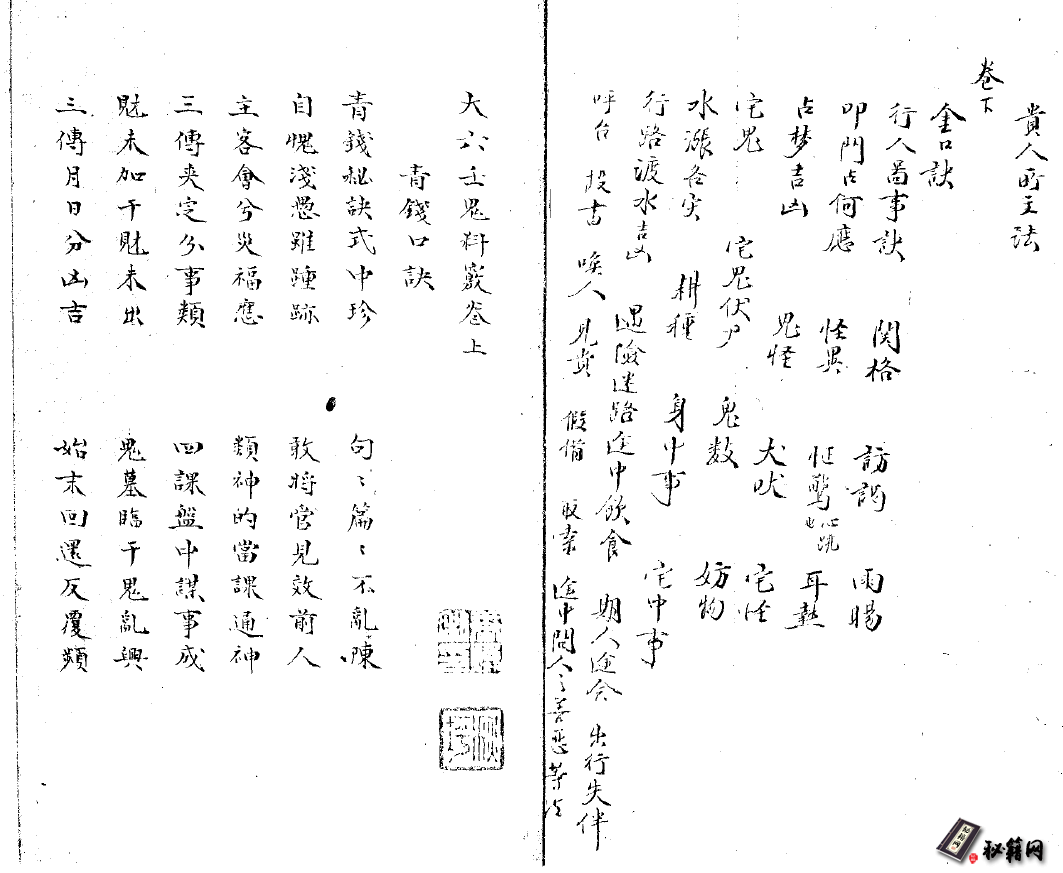 下卷:金口诀、行人鄙事诀、叩门占何应、宅中事、行路渡水吉凶、遇险迷路逢中饮食、出行失伴、、、等