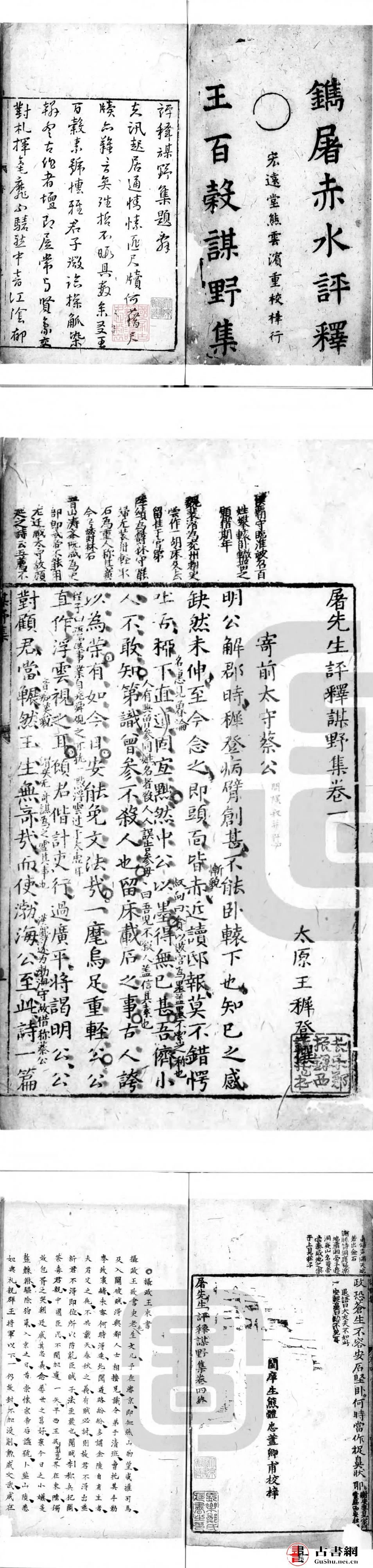 古籍.屠先生评释谋野集. 四卷. 明. 王穉登撰. 屠隆评. 明宏远堂熊云滨刊本. 灰度胶片丨中国国家图书馆藏(有水印)
